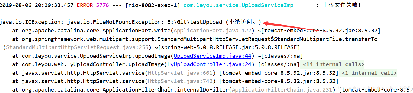 2019-08-06 20:29:33.457 ERROR 5776 — [nio-8082-exec-1] com.leyou.service.UploadServiceImp : 上传文件失败!