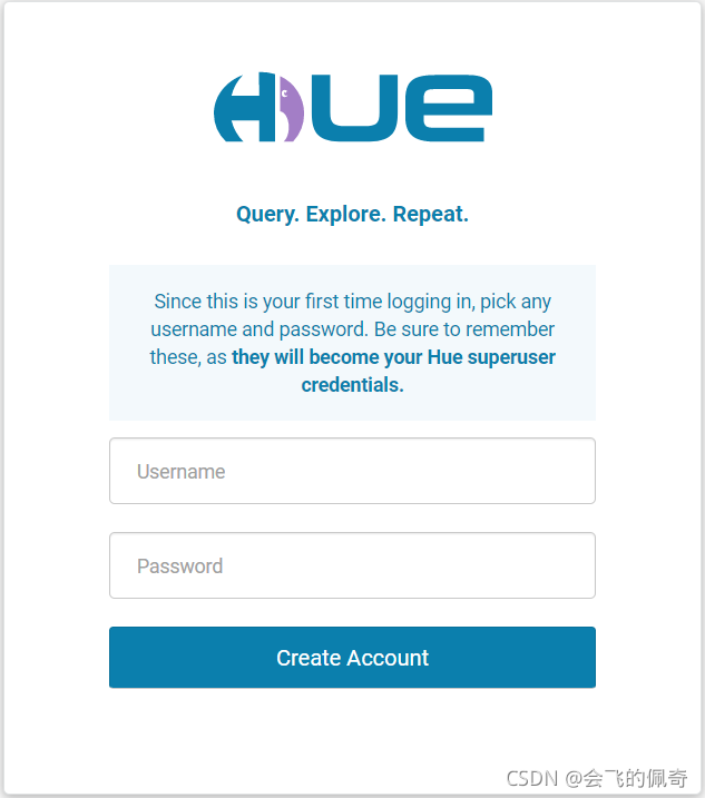 第一次访问的时候,需要设置超级管理员用户和密码。记住它(hue/123456)。