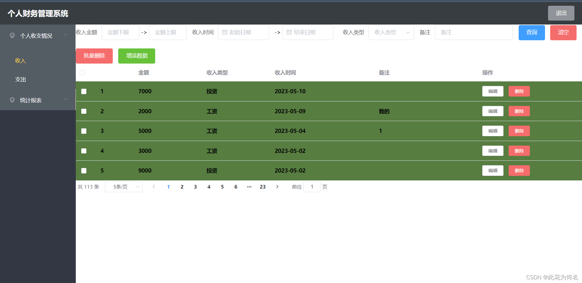 收入与支出界面相同,功能相同。可以对数据进行增添、删除、批量删除、修改(有数据回显)、复合条件查询、分页。以上功能均实现。