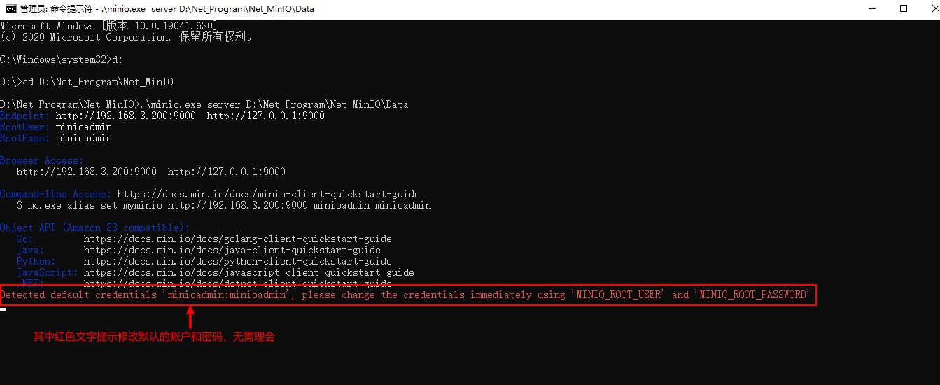 .\minio.exe server D:\Net_Program\Net_MinIO\Data