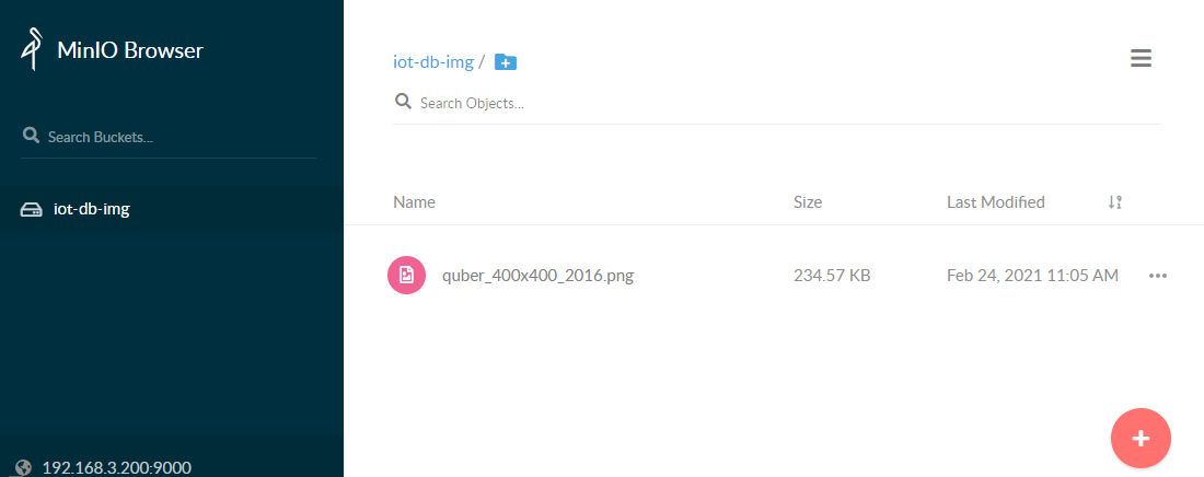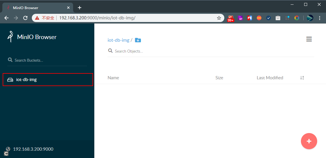 点击右下角的加号按钮,点击Create bucket按钮,如这里我们创建了一个名称为iot-db-img的Bucket(创建的Bucket就相当于存放文件的文件夹名称)