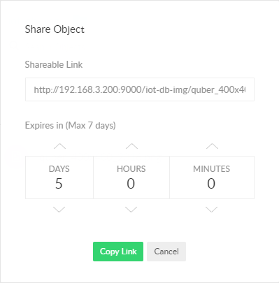 点击上传文件后面的三个点按钮,点击Share按钮即可复制到文件的链接地址,但是此时的文件链接地址是只有5天的