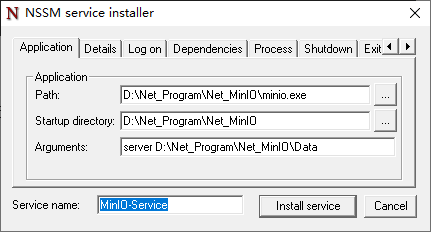 Argument:为启动服务的参数,此处填写server D:\Net_Program\Net_MinIO\Data