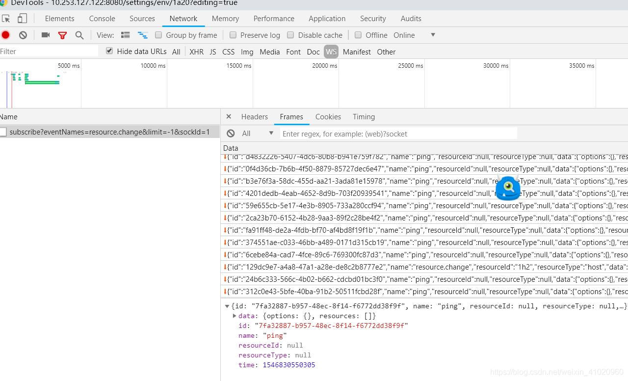 2.选择ws,然后刷新浏览器,开发者工具开始监听,其中ping是维持心跳保持websocket连接。