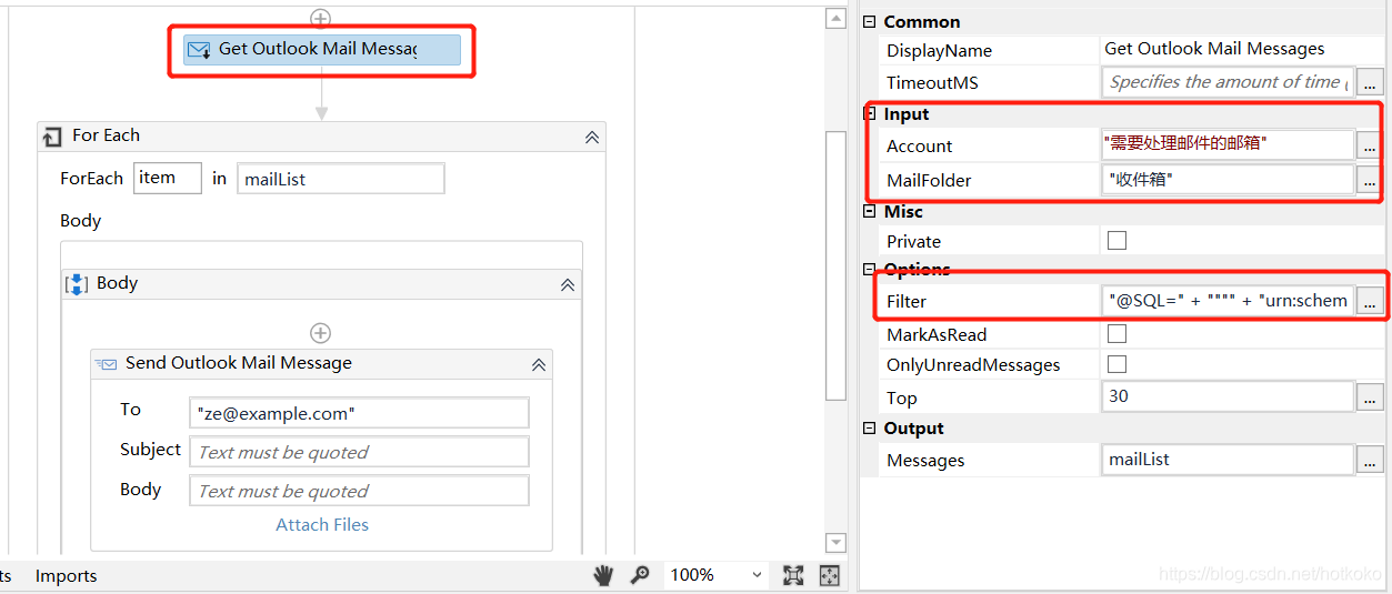 (1)首先通过get outlook mail message获取到需要处理的邮箱的指定邮件,赋值给mailList变量