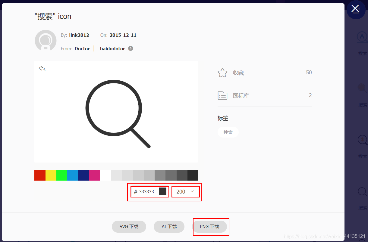 7. 再点击一下下载按钮,出现如下图,选择颜色和尺寸,点击 “PNG下载”;