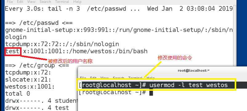 采用的命令为:username -l test westos