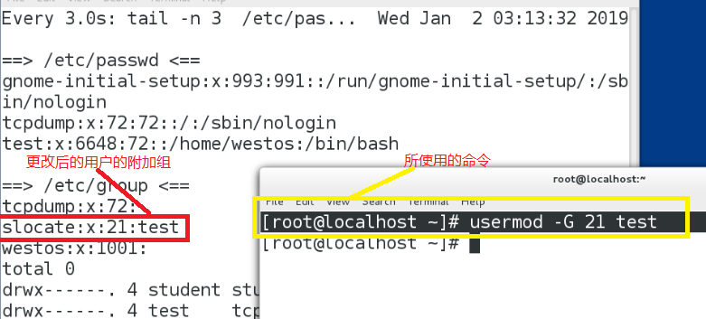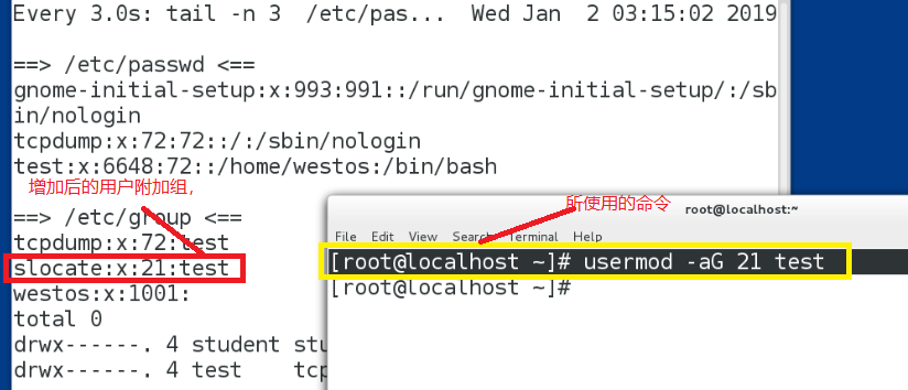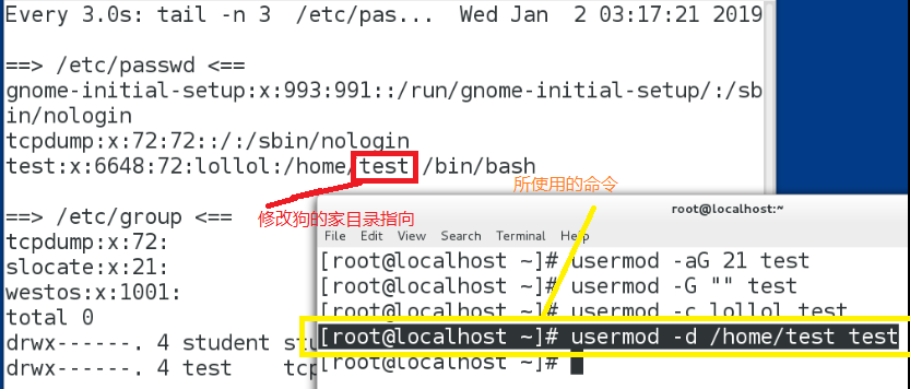 使用watch –n 3 ‘tail –n 3 /etc/passwd /etc/group;ls –l /home ’命令进行监控