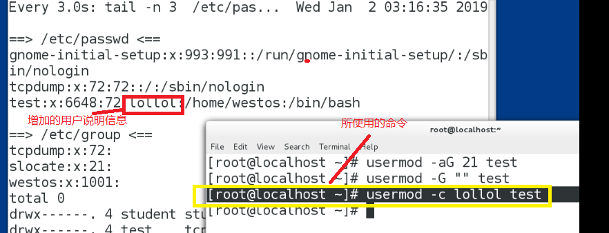 使用命令:usermod -c lollol test
