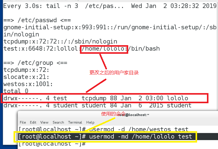 使用命令:usermod -md /home/lololo test
