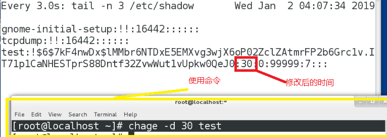 使用命令:chage –d 30 test