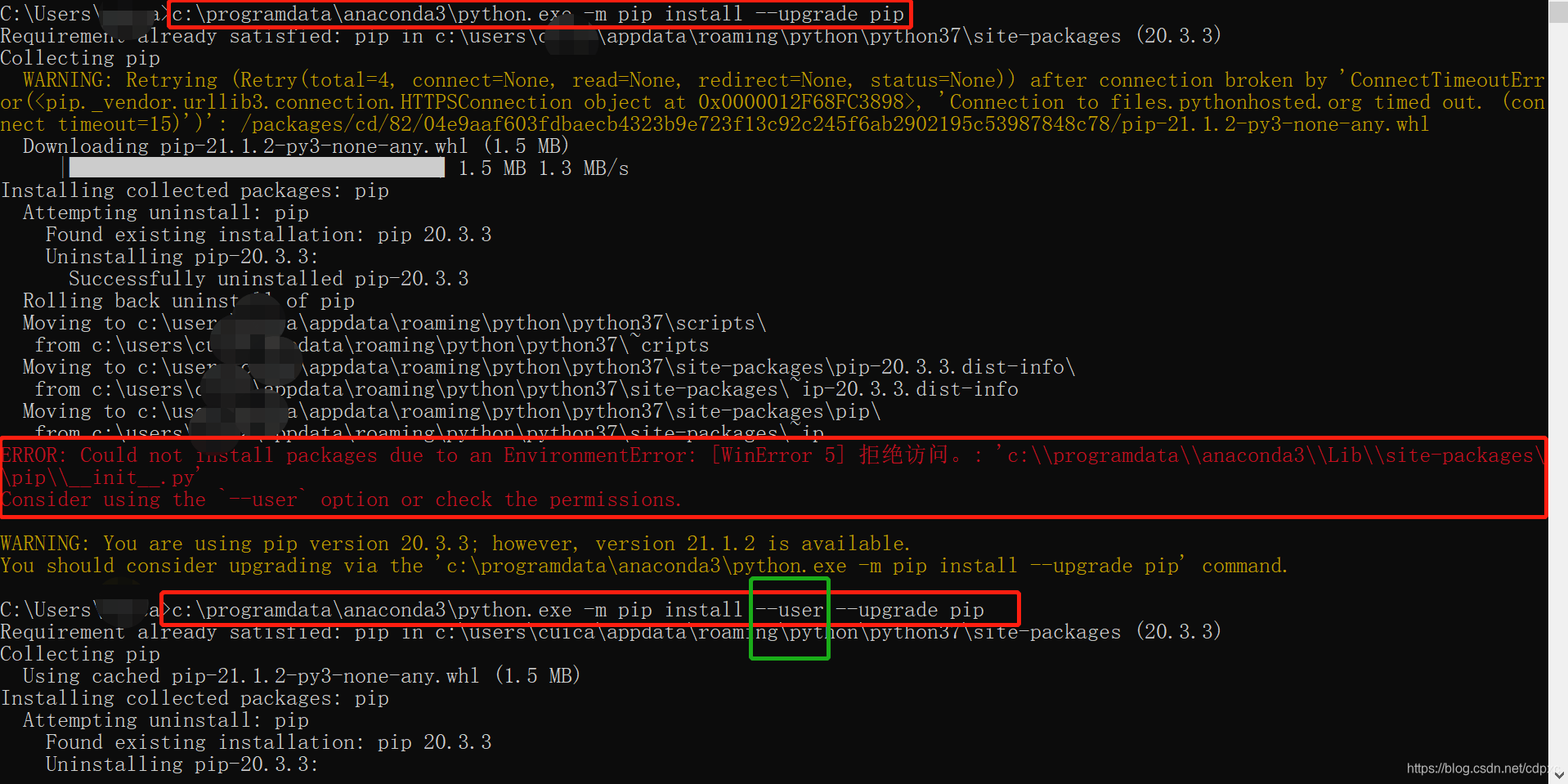 一定要注意用cmd命令提示符时,报错后续会提出对应的解决方式。如图片所示:Consider using the `–user` option or check the permissions.因此,在升级安装包时,需要加–user,即xxx pip install –user –upgrade xx