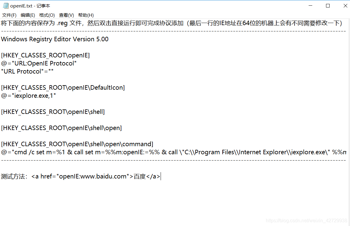测试方法:<a href="openIE:www.baidu.com">百度</a>