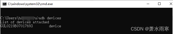 3)连接成功后,cmd命令窗口重新运行adb devices命令,真机设备连接成功,如下: