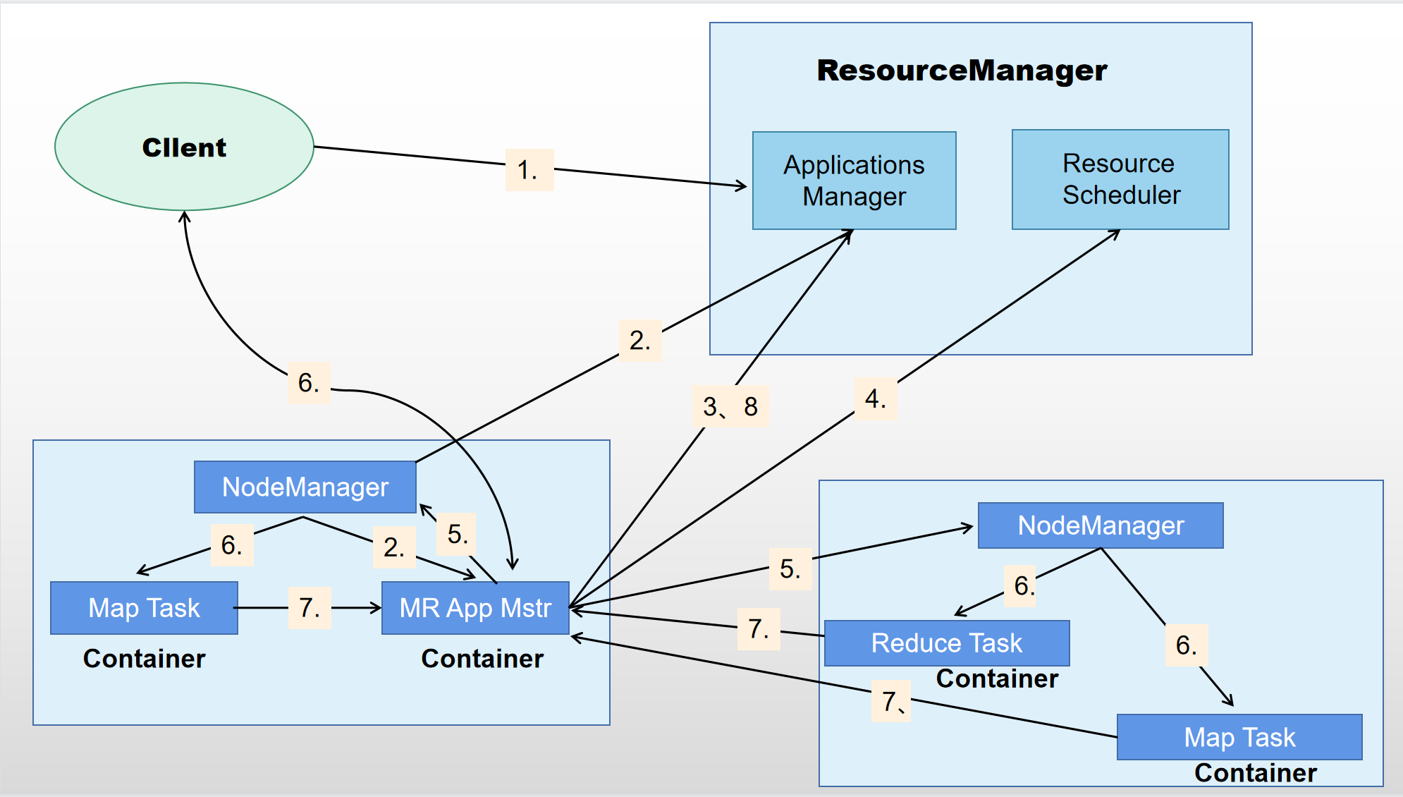 - YARA中的ResourceManager负责接收和处理来自客户端的请求,为应用程序分配一个容器,在该容器中启动一个ApplicationMaster.
