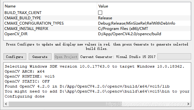 在OpenCV目录下新建一个目录放编译文件,我这里是这样的 D:\App\OpenCV4.2.0_withContrib\opencv\new_build ,我将它命名为new_build,可以随意起名,但是最好在OpenCV目录下,打开CMake,路径选择图下图所示(按自己的目录来进行相应的修改),然后点击configure,选择自己Visual Studio版本,我的是Visual Studio 2017也就是VS15,在第二个下拉框选择处理器位数,我的是64位,所以选择x64,然后点击Finish,这过程需要挺久的时间,期间会显示downloading xxxxx 然后有时候可能会变成红色下载失败,但是没事,等他继续下去,直到出现configure done。