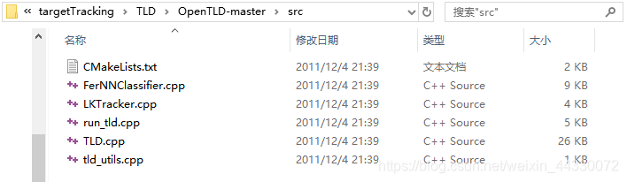 - 将OpenTLD源代码包里的头文件和源文件复制到VS当前工作目录(这个我理解的是D:\targetTracking\TLD\OpenCvTLD\OpenCvTLD这个目录,也可能是这个的上一级,应该没什么影响。)OpenTLD-master\include目录下面的是头文件,OpenTLD-master\src目录下面的是源文件。
