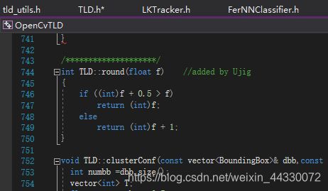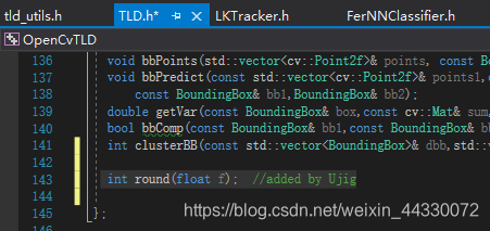 添加round函数,因为这个函数在VS中并没有自带,而OpenTLD用到了这个函数。在TLD.h中如下图所示的位置中添加下行代码。