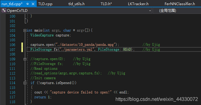 所以在这里也写一下怎么使用DEMO,首先将OpenTLD下的datasets文件夹和parameters.yml复制到当前工程目录中,然后修改主函数的代码,读取视频,然后就可以框选物体,进行目标跟踪了。如下图所示,注释一部分代码,并添加一部分代码: