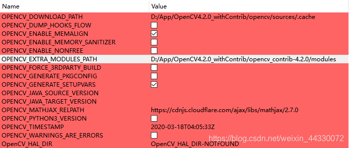 配置完成后在中间的框里找OPENCV_EXTRA_MODULES_PATH,将Opencv_contrib的modules目录放进去,同时保证WITH_CUDA未被勾选,我的默认是不勾选的。然后再点击一次Configure等待,再次出现Configure done就成功了。如下图,参考我的目录进行相应的修改: