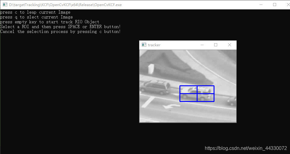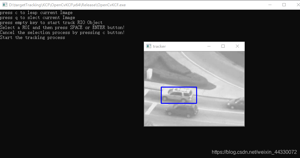 #include <opencv2/core/utility.hpp> #include <opencv2/tracking.hpp> #include <opencv2/videoio.hpp> #include <opencv2/highgui.hpp> #include <iostream> #include <cstring> using namespace std; using namespace cv; int main() { // declares all required variables //! [vars] Rect2d roi; Mat frame; //! [vars] // create a tracker object //Ptr<Tracker> tracker = Tracker::create("KCF"); //新版本OpenCV不再用这个Tracker //! [create] Ptr<TrackerKCF> tracker = TrackerKCF::create();//高版本一般是这样创建KCF的 // set input video //! [setvideo] std::string video = "D:\\targetTracking\\KCF\\car.mpg"; VideoCapture cap(video); //! [setvideo] //added by Ujig if (!cap.isOpened()) { return 0; } cout << "press c to leap current Image" << endl; cout << "press q to slect current Image" << endl; cout << "press empty key to start track RIO Object" << endl; //end added // get bounding box //! [getframe] cap >> frame; //! [getframe] //added by Ujig while (1) { char key = waitKey(1); if (key == 'c') // 按c键跳帧 { cap >> frame; } if (key == 'q') // 按q键退出跳帧 { break; } imshow("first", frame); } cv::destroyWindow("first"); //end added //! [selectroi]选择目标roi以GUI的形式 roi = selectROI("tracker", frame); //! [selectroi] //quit if ROI was not selected if (roi.width == 0 || roi.height == 0) return 0; // initialize the tracker //! [init] tracker->init(frame, roi); //! [init] // perform the tracking process printf("Start the tracking process\n"); for (;; ) { // get frame from the video cap >> frame; // stop the program if no more images if (frame.rows == 0 || frame.cols == 0) break; // update the tracking result //! [update] tracker->update(frame, roi); //! [update] //! [visualization] // draw the tracked object rectangle(frame, roi, Scalar(255, 0, 0), 2, 1); // show image with the tracked object imshow("tracker", frame); //! [visualization] //quit on ESC button //if (waitKey(1) == 27) //by Ujig // break; //added by Ujig if (char(waitKey(1)) == 'q') { cv::destroyWindow("tracker"); break; } } return 0; }其中
