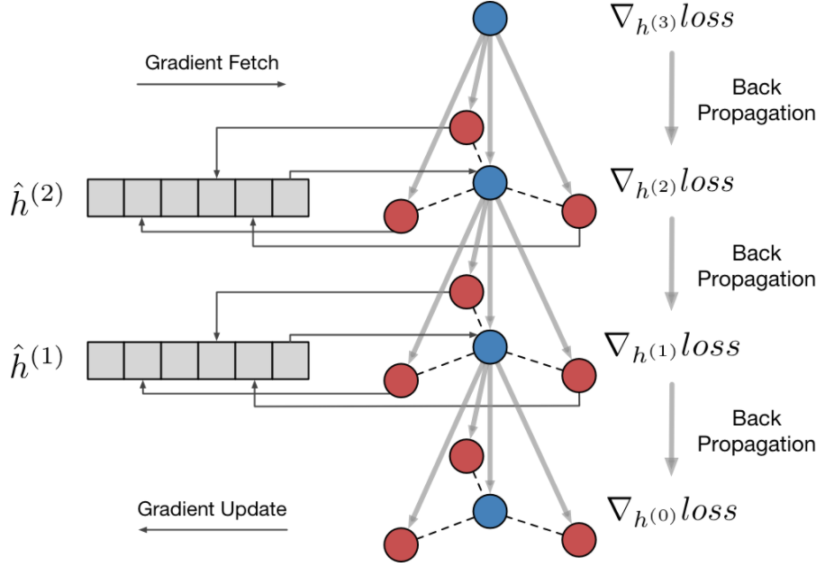 ,将mini-batch SGD中各顶点最新的前阶embedding存储起来,前向Aggregate的时候直接查询缓存。