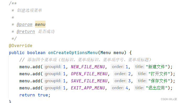 menu.add(1, NEW_FILE_MENU, 1, "新建文件");