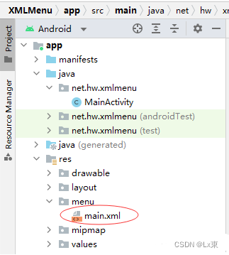 在res目录下创建menu目录,在里面创建菜单配置文件 – main.xml