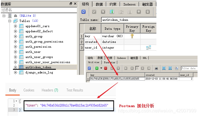 在 Django REST Framework 构建的项目下,查看数据库,可以看见一个 authtoken_token 的数据表。key 字段用于存放生成的 Token 值,user_id 字段是外键,用于关联 auth_user 表,知道是哪个用户产生的 token 值,created 字段是该 Token 的创建时间,当需要设置 Token 过期时间的时候可以进行参考。