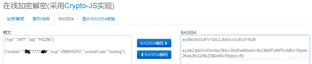 Base64 并不是一个加密算法,而是一种基于64个可打印字符来表示二进制数据的方法,即把数据、文件(如图片)等以64个可见字符的方式来表示,便于网络的传输和处理。我们可以通过在线工具将前面图片中抓的 JWT 值前两部分进行解码。可以看到,当前的 JWT 使用了 HS256 的加密算法,而且记录了用户的 “电话号码(识别用户身份)” 和 “学校编码”信息。