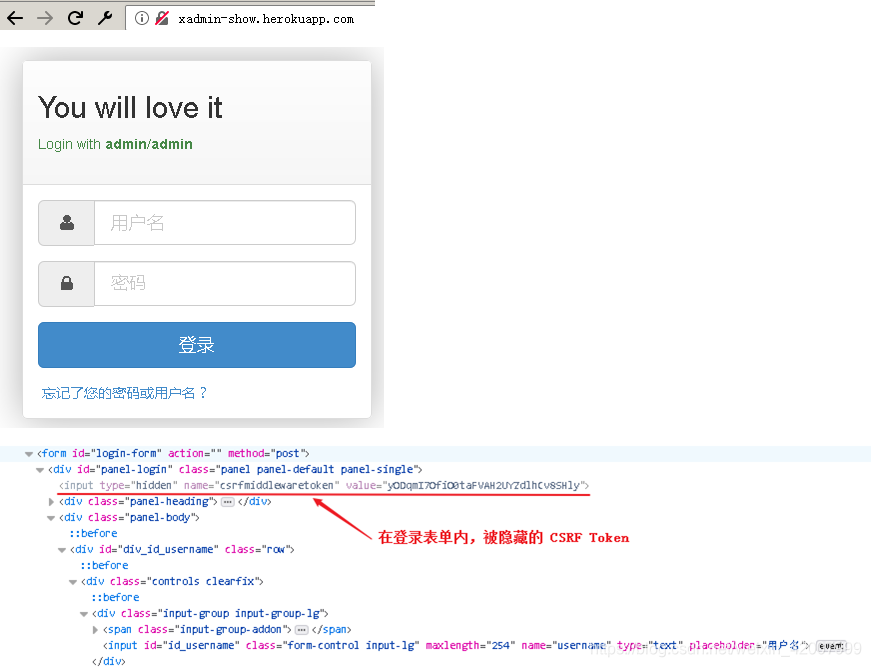 在 Django 中专门有针对 CSRF 的处理。而 Xadmin 是一个基于 Django 编写的,可以替代 Django 自身的 admin 后台的管理工具。访问其官网的“示例”登录页面,直接查看页面源码,在登录表单中可以清楚的找到 CSRF Token 的内容。