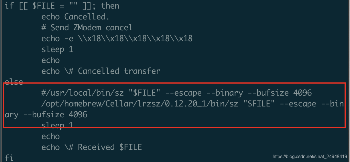 按照图中框选的,把原始的上面那行注释,更改为下面那行,就ok了。 同理,iterm2-recv-zmodem.sh也是一样的方法。