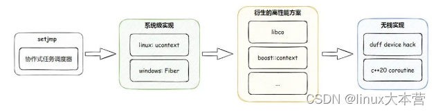 - 由系统级实现所衍生出的高性能方案, 一般是借签系统级的实现, 移除一些非必须的操作所达成的, 代表的方案有大家熟知的 libco 和 boost::context, 也就是我们通常所说的有栈协程实现