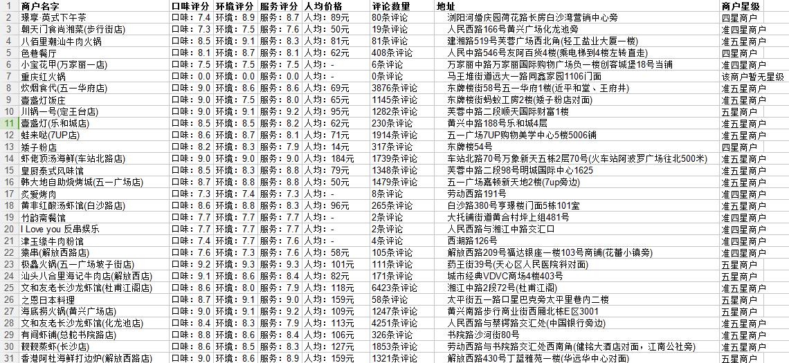 数据说明: 本次爬取大众点评共8个字段信息,包括: 商户名字, 口味评分, 环境评分,服务评分,人均价格,评论数量,地址,商户星级