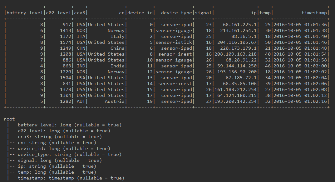 (17, """{"device_id": 17, "device_type": "sensor-ipad", "ip": "64.124.180.215", "cca3": "USA", "cn": "United States", "temp": 38, "signal": 17, "battery_level": 9, "c02_level": 1304, "timestamp" :1475600532 }"""),