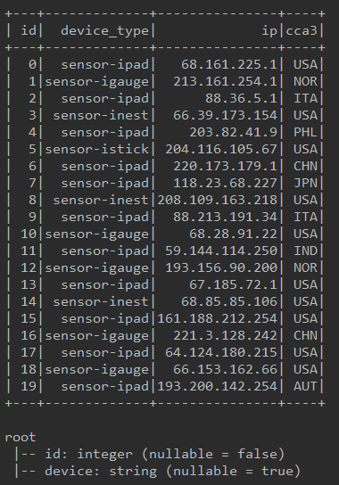 // A),使用上述schema从json字符串中抽取属性和值,并将它们视为devices的独立列。