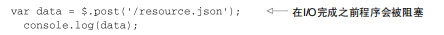 在这个例子中,假定对resource.json的响应在准备好后会存储在变量data中,并且在此之前函数console.log不会执行。I/O操作(Ajax请求)会“阻塞”脚本继续执行,直到数据准备好。