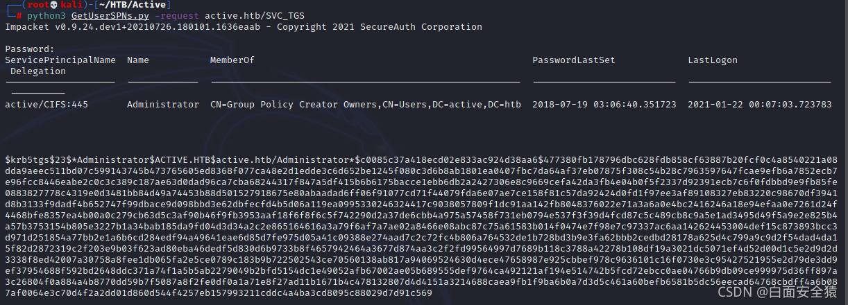 可以利用GetUserSPNs.py从impacket得到管理员Kerberos凭证