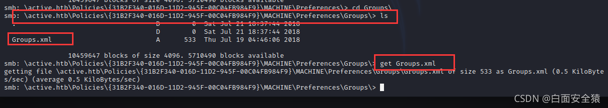 在\active.htb\Policies{31B2F340-016D-11D2-945F-00C04FB984F9}\MACHINE\Preferences\Groups\发现Groups.xml
