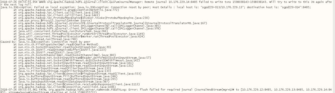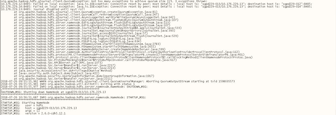 通过日志可以看到NN显示无法连接sgpd229-012和sgpd229-014节点的JN服务,此时NN服务判断JN服务不可用,直接SHUTDOWN,导致NameNode服务异常退出。