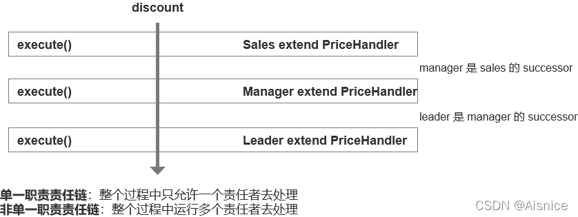 //单责任链方式,当有责任人执行则退出责任链,非单责任链,不需要关注责任者的执行情况 因此handleProcess可设置为void