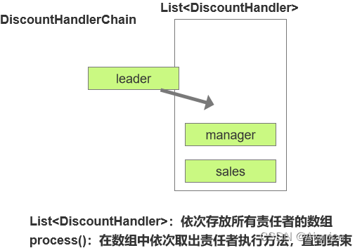 这里的重点是,责任者处理完自身业务后需要执行责任链的process()方法,进行下一责任人的转移,类似filter的chain.doFilter,然后由责任链管理对象DiscountHandlerChain去进行责任人的迭代调用