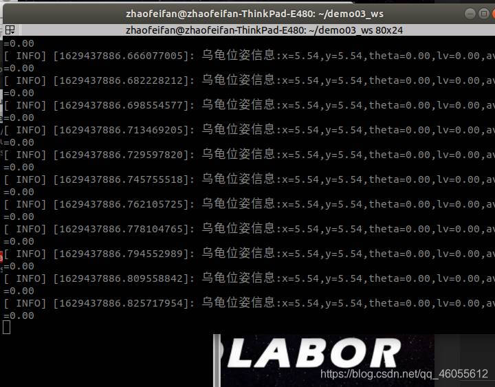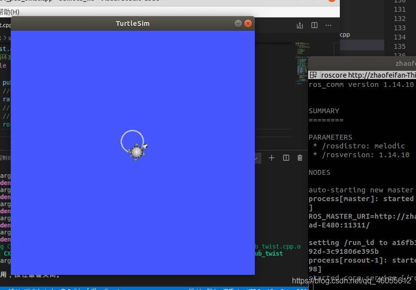 void doPose(const turtlesim::Pose::ConstPtr& p)3.启动乌龟显示节点,执行运动控制节点,乌龟位姿订阅节点,最终获取到乌龟当前的位姿信息。