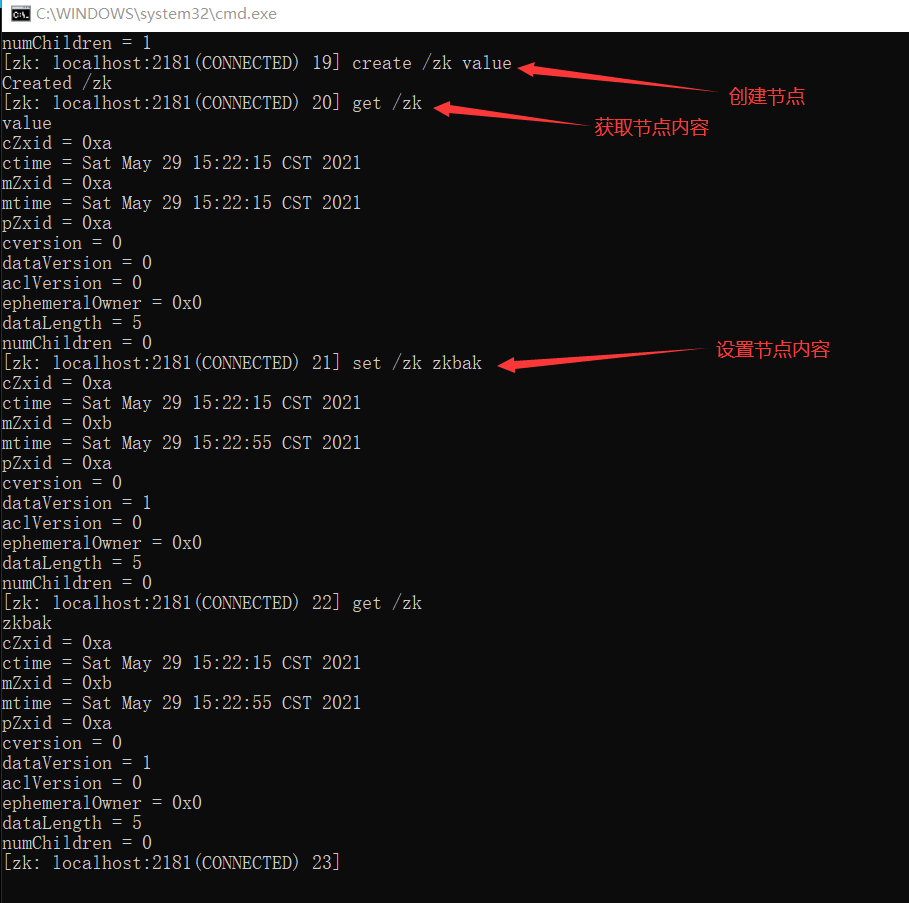 第二点需要注意的是,每一个 znode 都必须有值,如果没有值,节点是不能创建成功的。