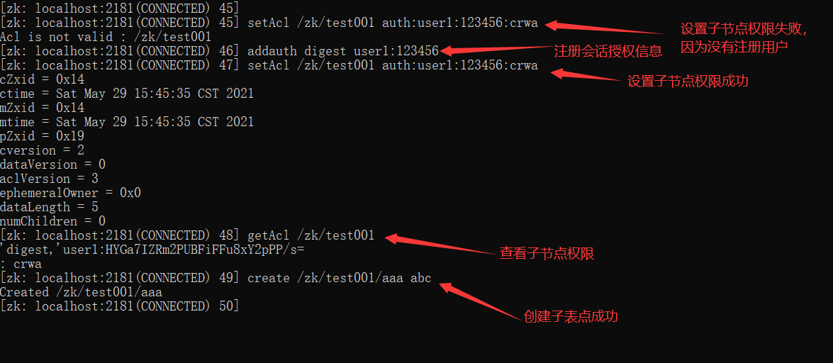 setAcl /testDir/testAcl auth:user1:123456:crwa # 然后才可以拿着这个用户去设置权限