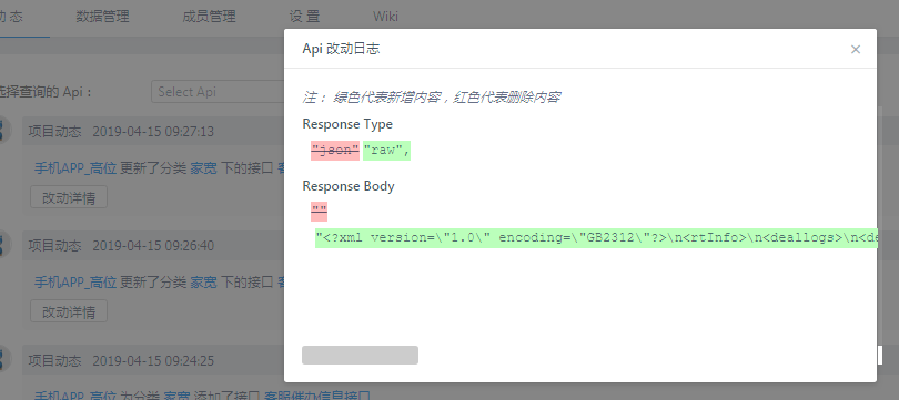 点击改动详情,可查看接口的具体改动内容。红色表示删除的内容,绿色表示新增的内容。