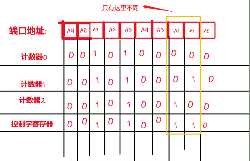 而他们的端口地址取决于与CPU相连的地址总线, 根据图所示, 即