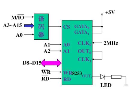 假设在一个8086系统中,使用8253控制一个LED的点亮或熄灭。四个端口地址分别是