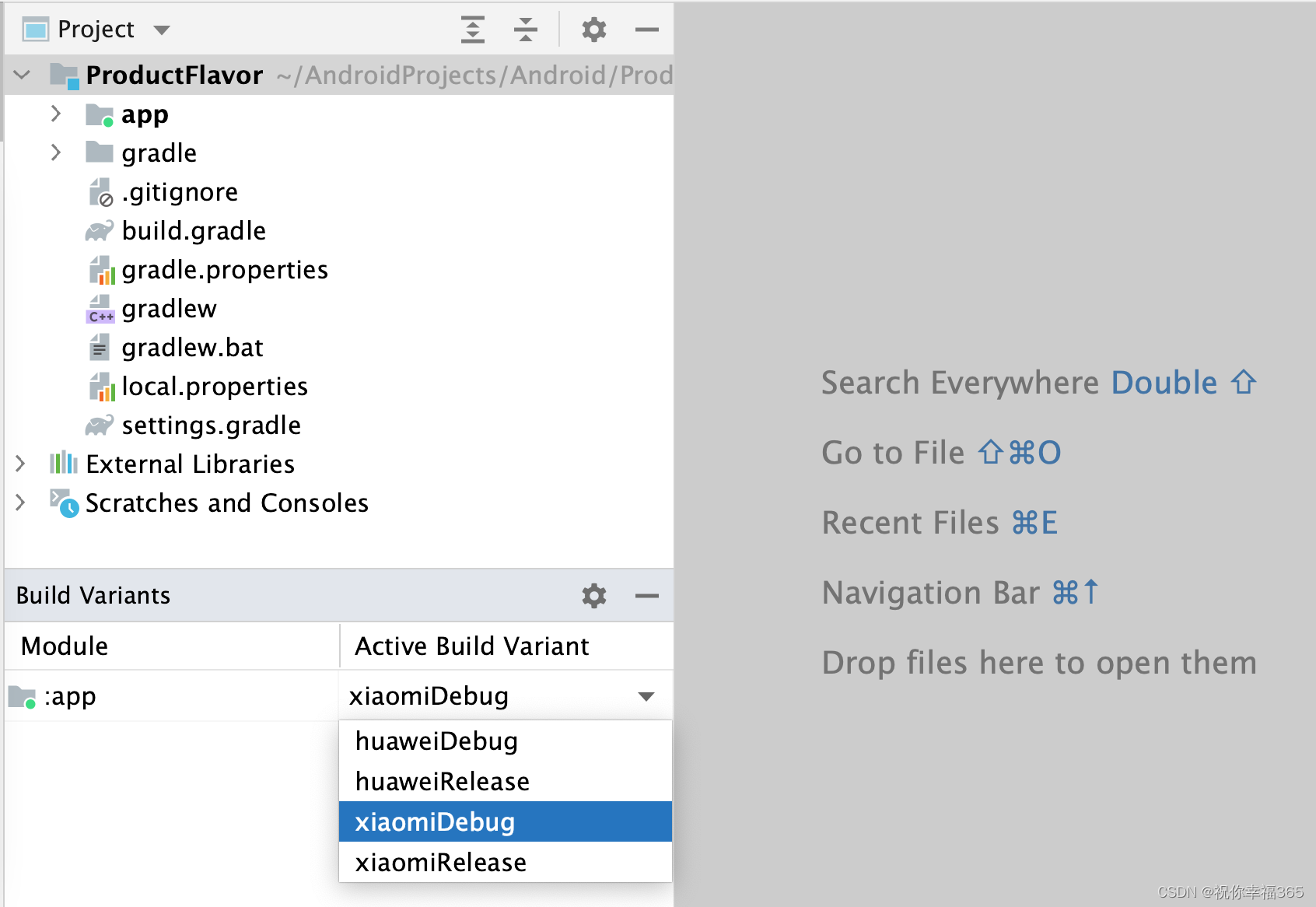 如果我们想在build的时候,就按照某种 flavor 进行打包,那么就可以在 Build Variants 中选择对应的 flavor 版本,然后正常编译即可编译出对应的apk。