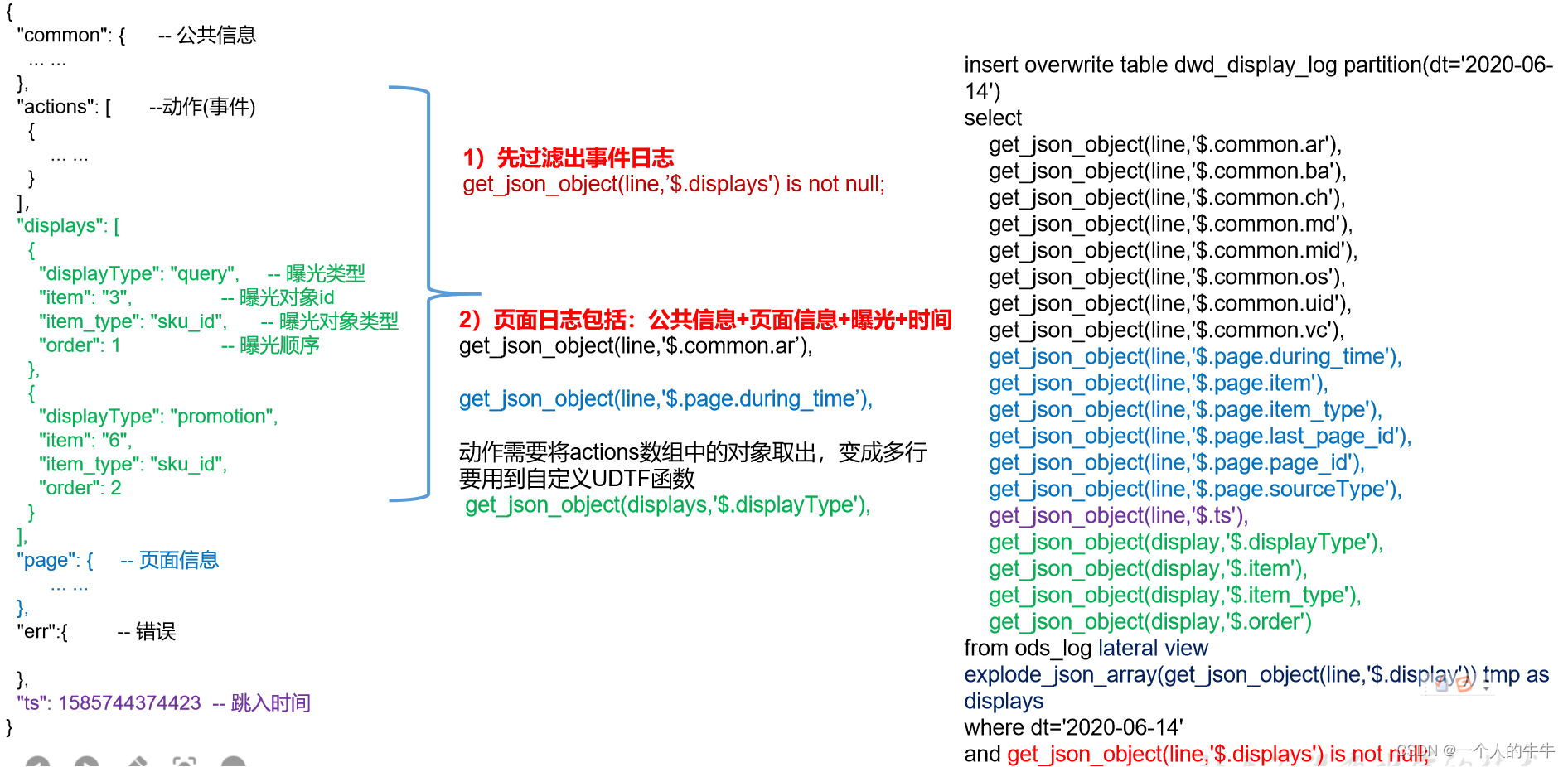 动作日志解析思路:动作日志表中每行数据对应用户的一个动作记录,一个动作记录应当包含公共信息、页面信息以及动作信息。先将包含action字段的日志过滤出来,然后通过UDTF函数,将action数组“炸开”(类似于explode函数的效果),然后使用get_json_object函数解析每个字段。